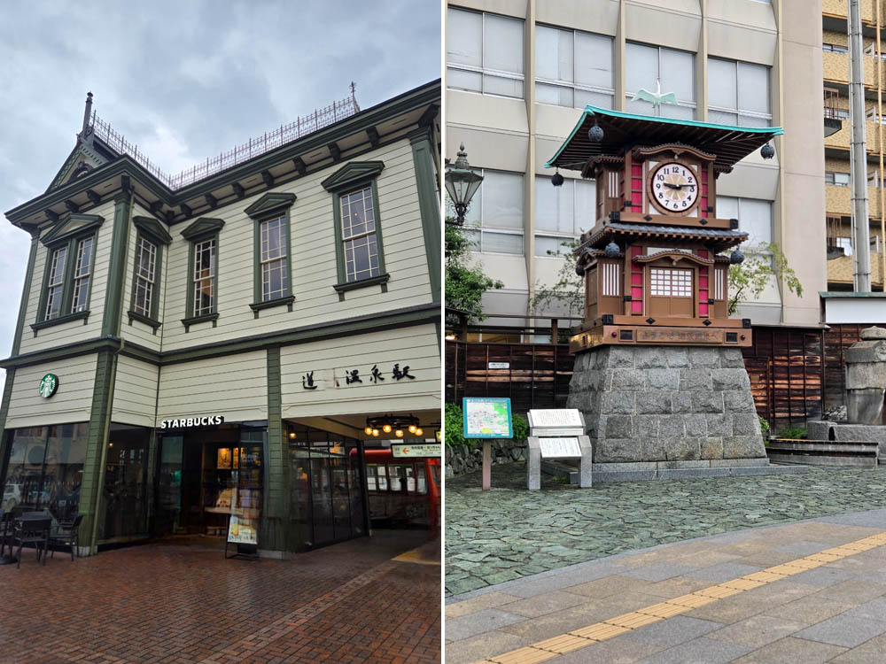 まずは道後温泉へ。駅前に停まっていた坊ちゃん列車がちょうど出発するジャストタイミングでした。