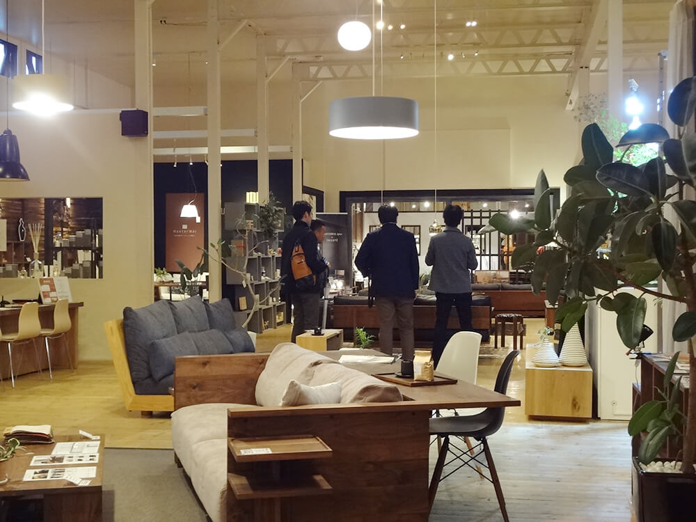 鳥屋野潟の湖畔にほど近い立地にある3棟の倉庫をショールームとしてリノベーションし、内装を星野社長様が手掛けられたとのこと。美しい空間に一同感嘆致しました。