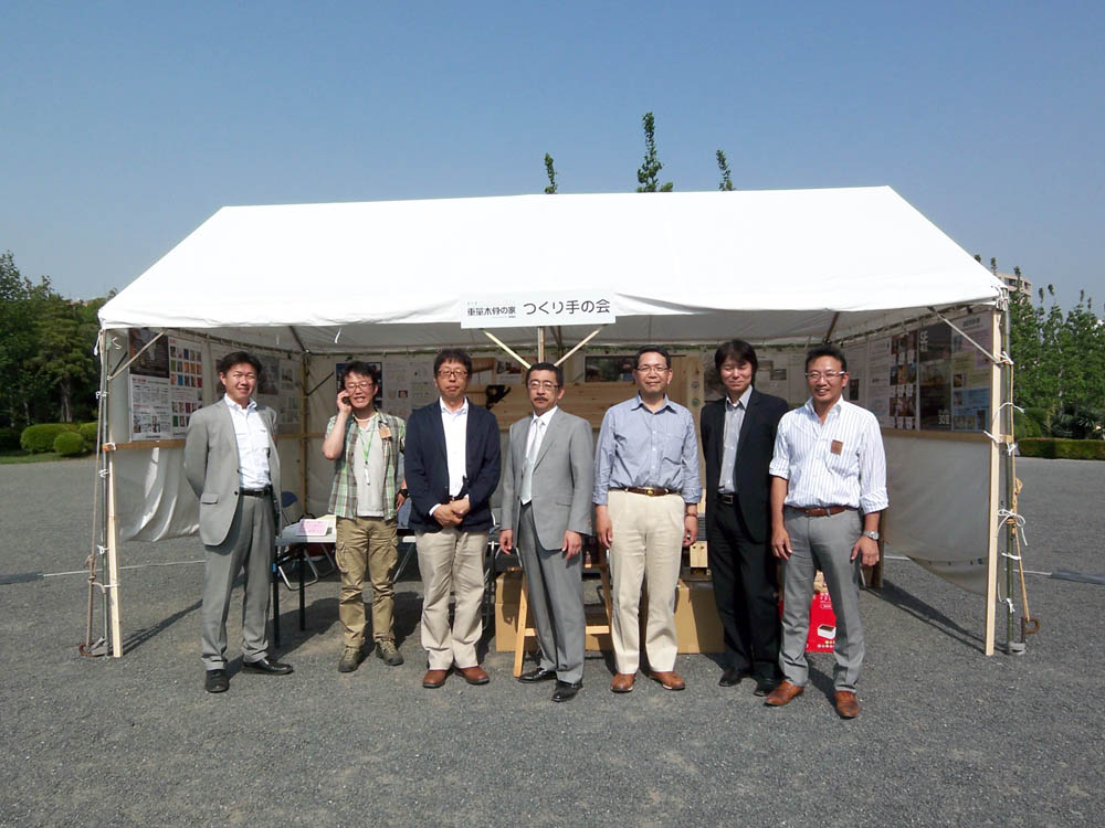 つくり手の会各社の説明パネルとSE構法の躯体模型を設置したテント。強烈な直射日光と紫外線を浴びながら、風や埃と戦いつつ、お客様に笑顔でご説明。お立ち寄り頂いたお客様には「つくり手の会謹製小冊子」などをプレゼントしました。